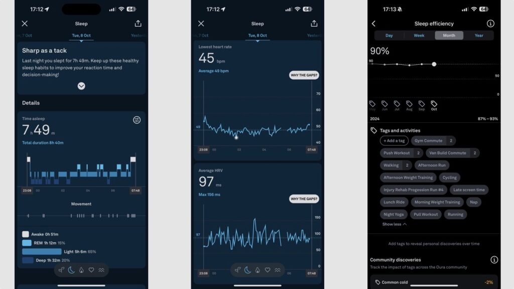 Even the best sleep trackers (such as Oura) can only manage around 80% accuracy compared to medical-grade sleeping equipment’s assessments of sleep stages, so take all this data with a pinch of salt.