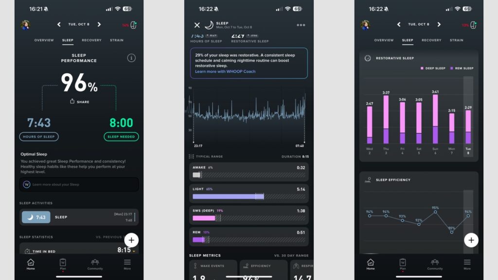 But the sleep-specific data is just as actionable. Whoop shows rolling trends of your time in bed, sleep schedule consistency, sleep efficiency, sleep debt (time you owe from late nights/early starts), and your percentage of restorative sleep time.