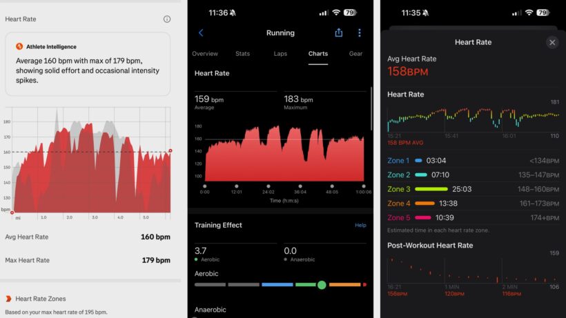 Latency remains slightly behind competitors like Apple (and the Garmin chest strap used in the test below), leading to a general trend of slightly underreported maximum figures. This issue was evident during both outdoor runs and gym sessions, with the latter being especially troublesome.