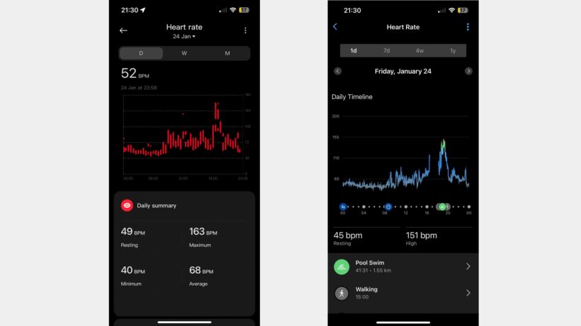 Despite improved heart rate performance claims, we didn’t see it during exercise or day-to-day tracking. It typically trended much higher than other watches we’ve come to rely on for continuous monitoring. You can adjust the frequency of that monitoring – yet, even in its most accurate mode, insights like resting and maximum heart rate ranges were off.