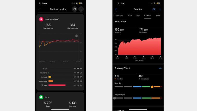 The GPS performance was as expected. It’s not as polished as a sports watch with more advanced GNSS support, and distance was frequently overreported. The GPS signal tended to notify us it was dropping out, and metrics like pacing and maximum heart rate readings were much higher than a dedicated heart rate monitor.