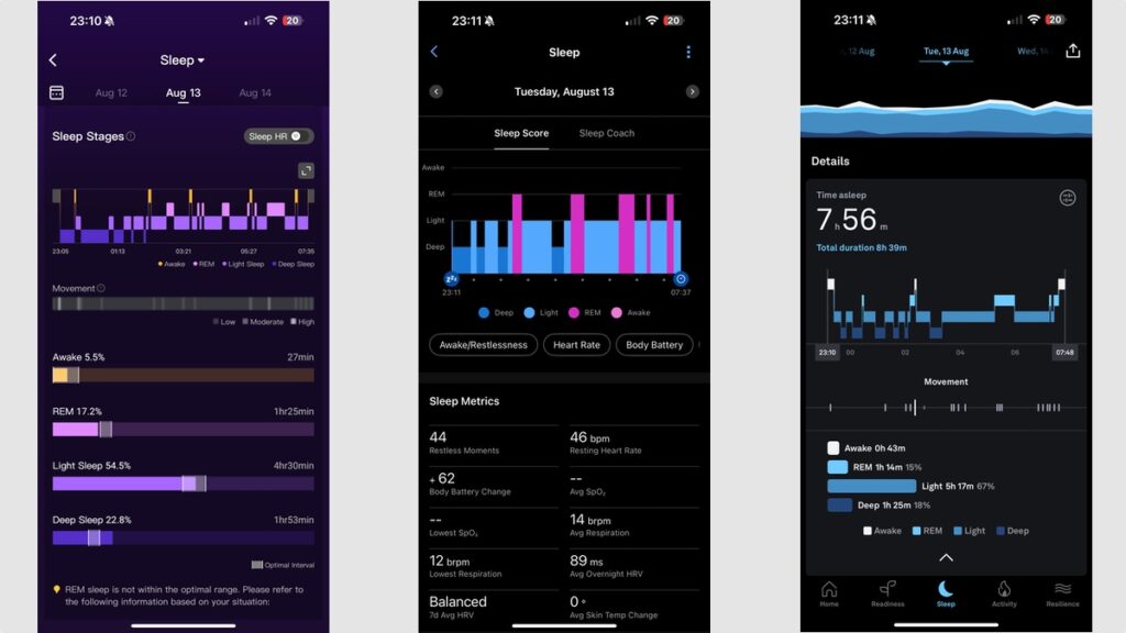 The core sleep tracking – stages, scores, efficiency, that kind of thing – remains excellent. Over an entire month, it loosely correlated with Oura’s sleep scores (the RingConn Gen 2’s average was 80, and its competitor’s was 82 for the same period), and fall-asleep times were always logged within 5 minutes or so of the Whoop 4.0, Garmin Fenix 8, and Oura Gen 3. It also negotiated those mid-sleep trips to the bathroom and the occasions when you can’t fall asleep with aplomb.