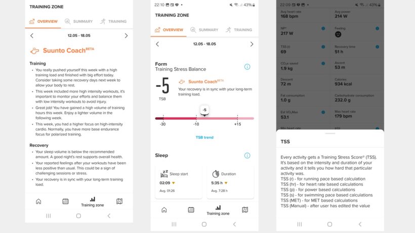 In the app, you can access the Suunto Coach, which is currently in beta testing. It provides a summary of your training, recovery, and progress, along with displaying your current training volume and load. For individual workouts, the app captures metrics like Training Stress Scores, abbreviated as TSS, or PTE, which is a scale showing the impact of your workout on your aerobic fitness.