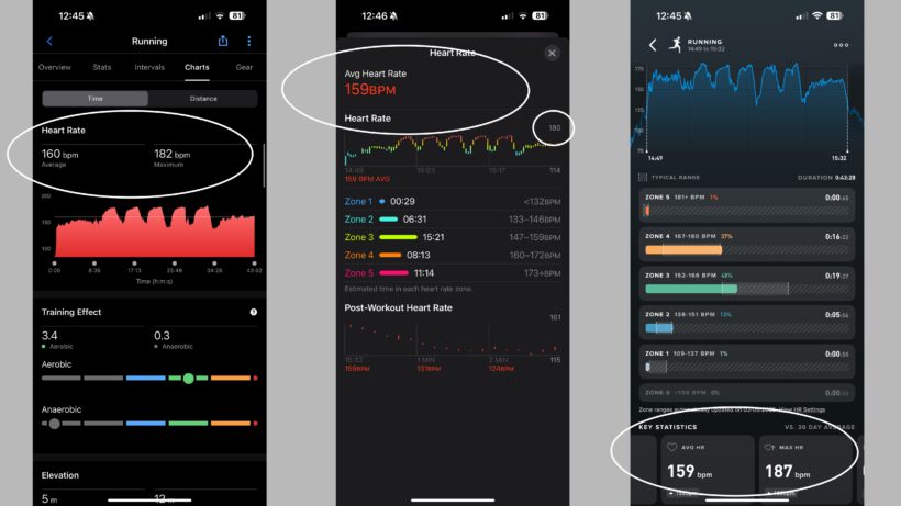A seven-mile, steady-paced run yielded an average of 153 BPM from the Garmin HRM-Pro Plus—widely considered the gold standard—and the Apple Watch Ultra 2, while the Whoop MG was surprisingly higher at 159 BPM. Another five-mile run with a longer middle interval was similar: Whoop MG at 165 BPM average, with the Apple Watch at 160 BPM and the Garmin chest strap at 161 BPM.